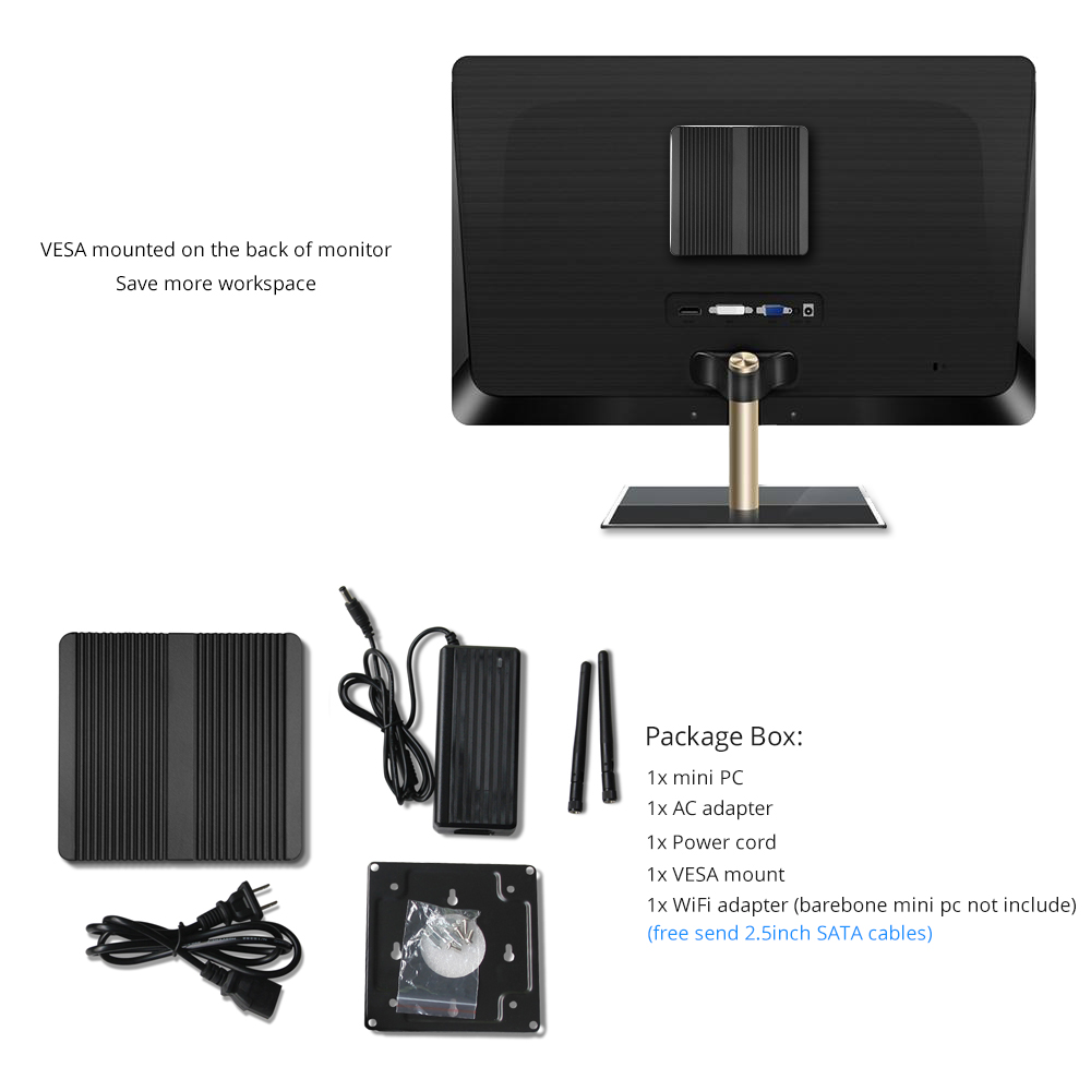 1x Mini PC 1x WIFI module and antenna ( Barebone not with ) 1x Power Cord 1x AC Adapter 1x Vesa mount 1x Warranty card 1x Power cable and data cable